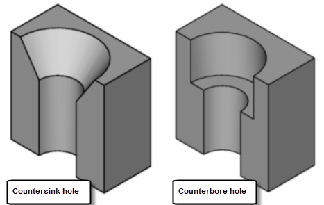a counterbore makes a flat-bottomed hole and its sides are drilled straight down. This is usually used to fit a hex-headed cap or screw. Only one countersink or counterbore hole per pad is allowed.