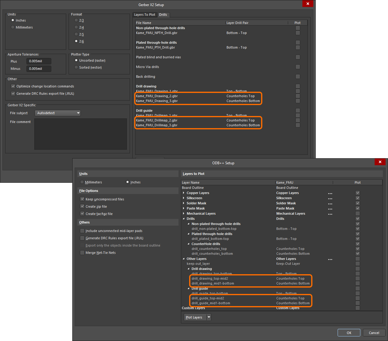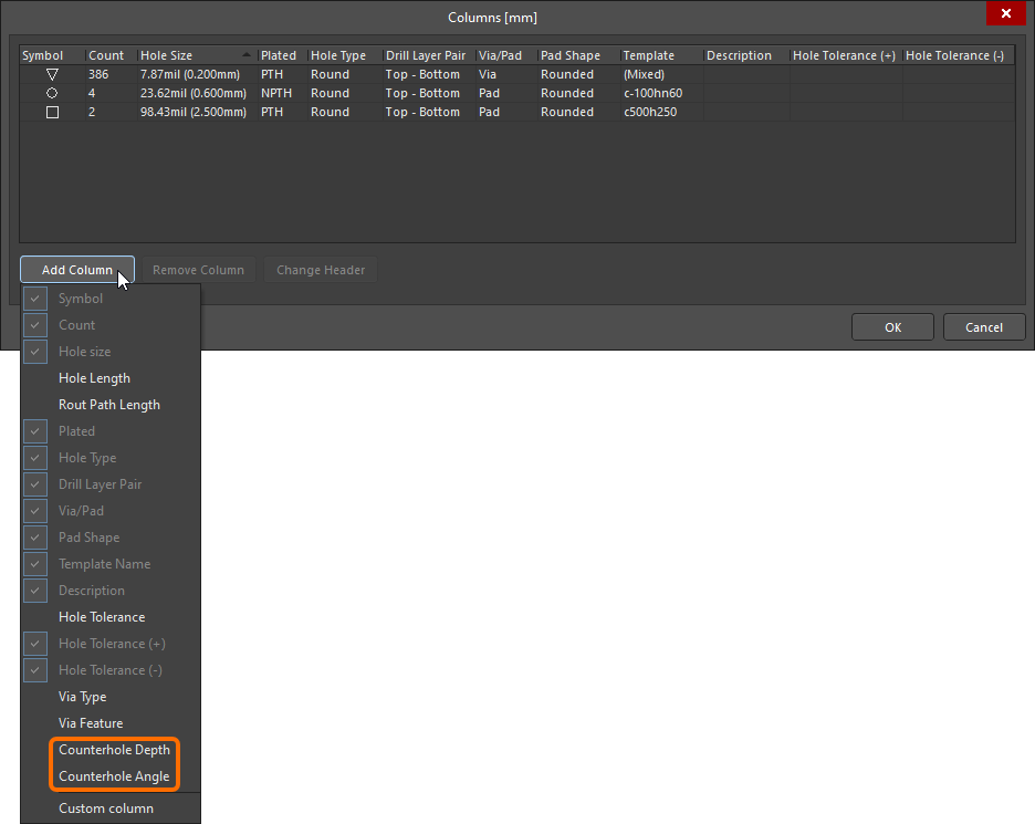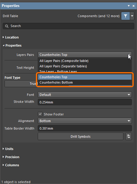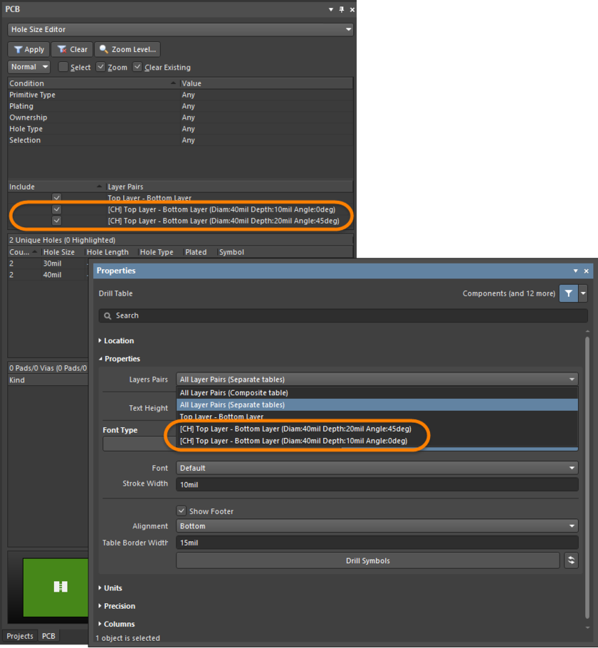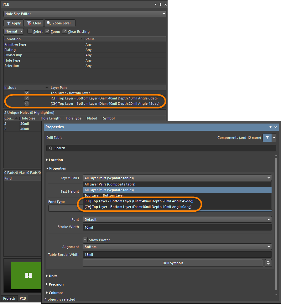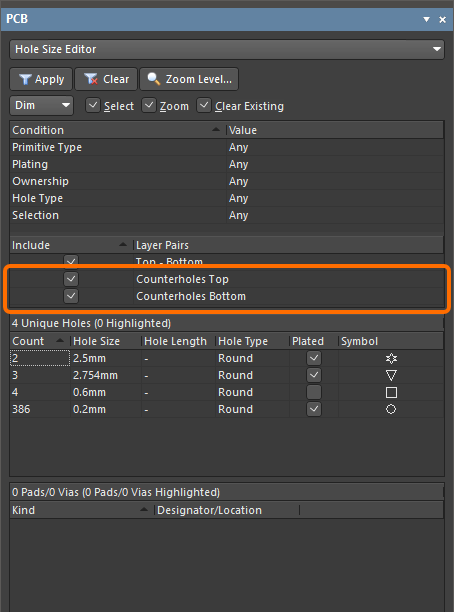 The counterholes display as Layers Pairs in the Properties panel modes of the Drill Table mode of the Properties panel and the Hole Size Editor mode of the PCB panel as