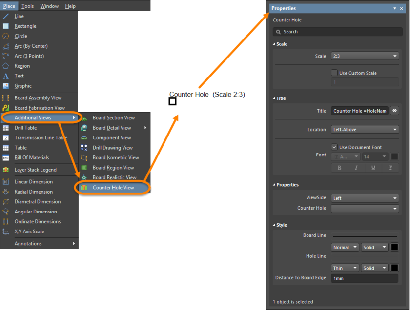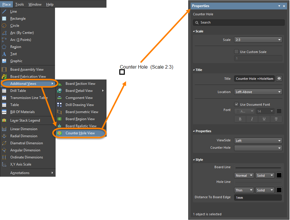 The Counter Hole View object has been added to Draftsman documents. A Counter Hole View can be placed by choosing Place » Additional Views » Counter Hole View from the main menus. The