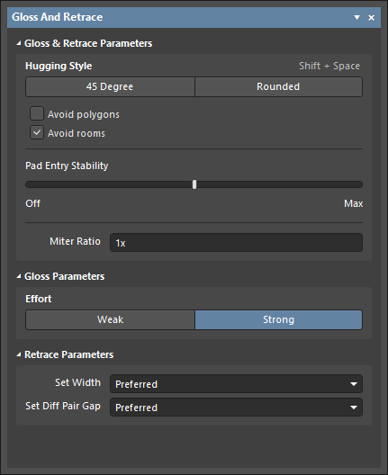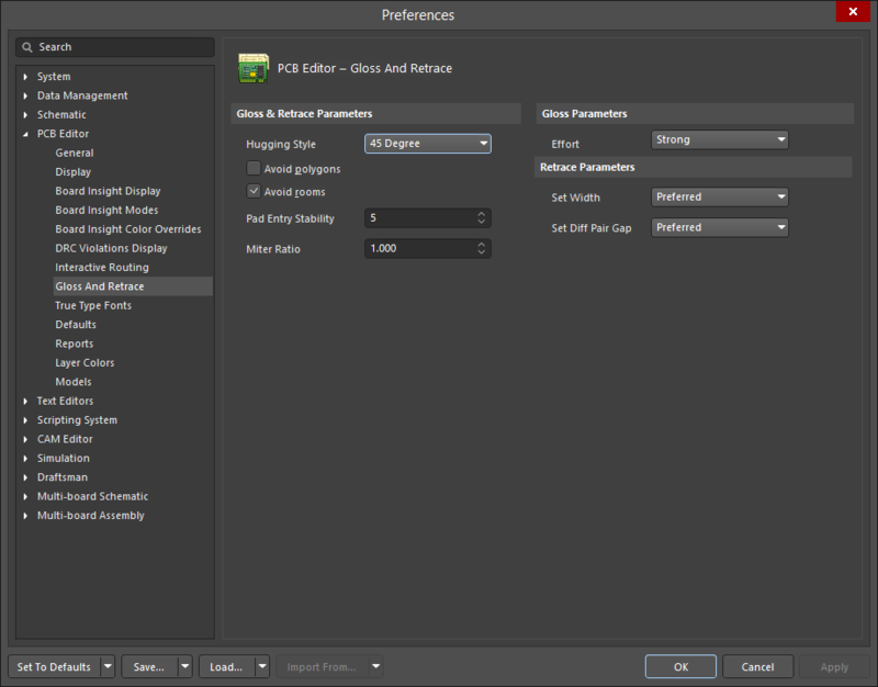 These Gloss and Retrace settings apply to the Gloss Selected or Retrace Selected commands. Glossing behavior during interactive routing or interactive sliding is controlled by the settings in the PCB Editor - Interactive Routing page of the Preferences dialog (which can also be configured while you are working in the Interactive Routing and Interactive Sliding modes of the Properties panel).