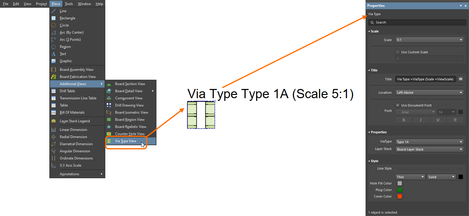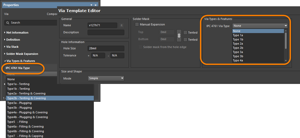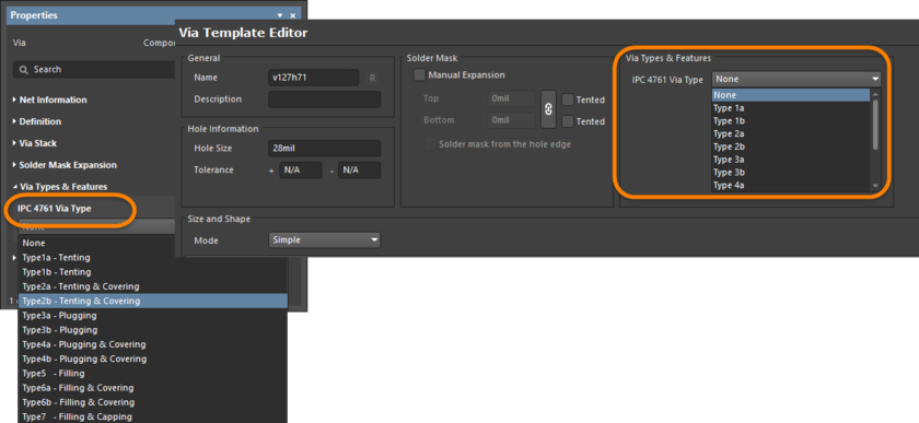 standard. Use the new IPC 4761 Via Type drop-down in the Via Types & Features region of the Via mode of the Properties panel or the Via Template Editor to select.