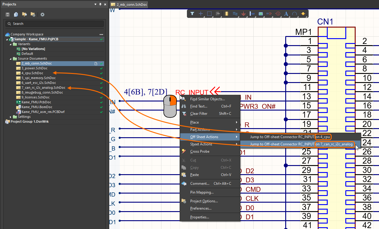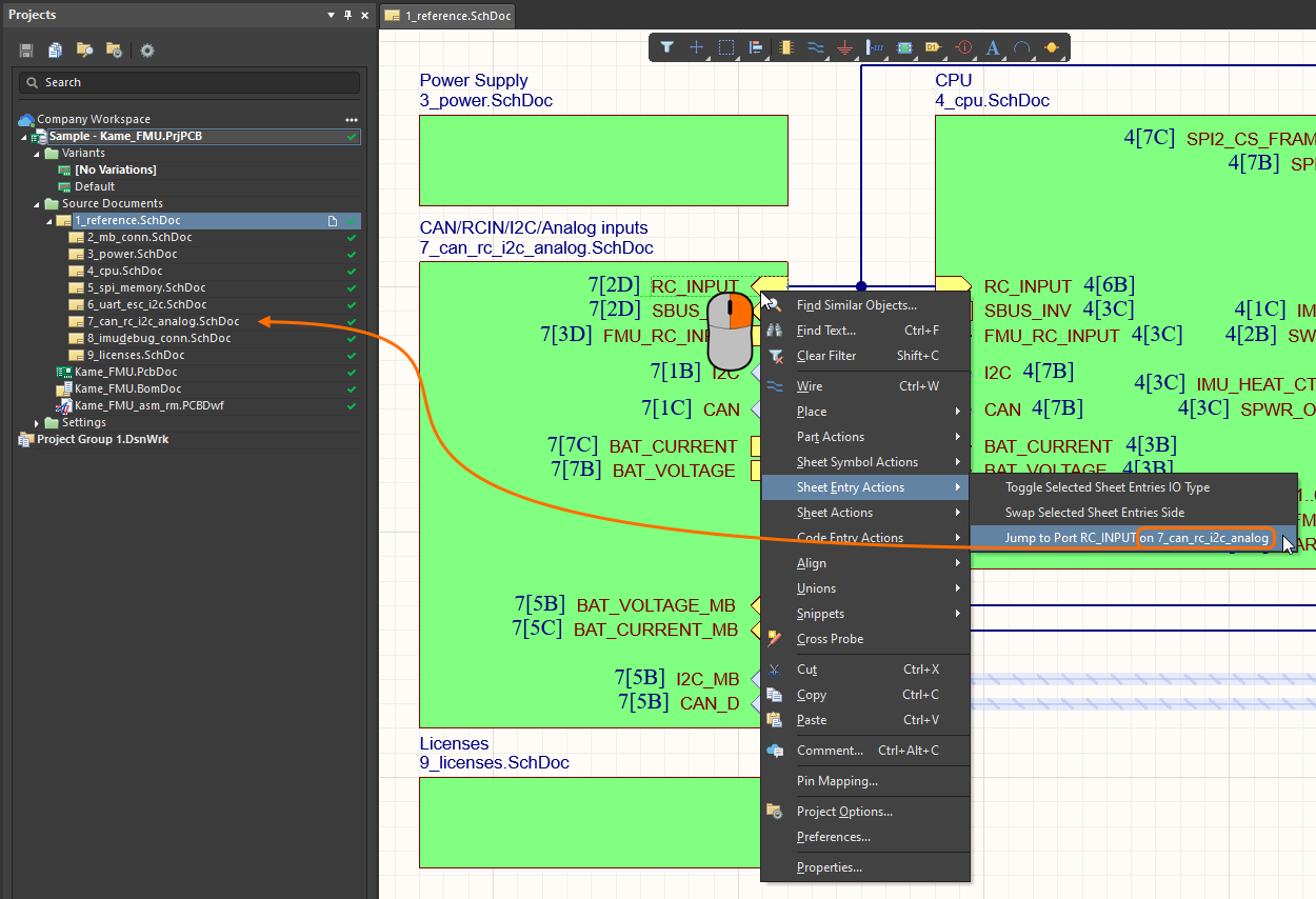 Support of cross references has also been extended in schematic PDF outputs. If an object is related to more than one connected object (e.g., a port is connected to a sheet entry on the parent schematic sheets and ports on other sheets), clicking