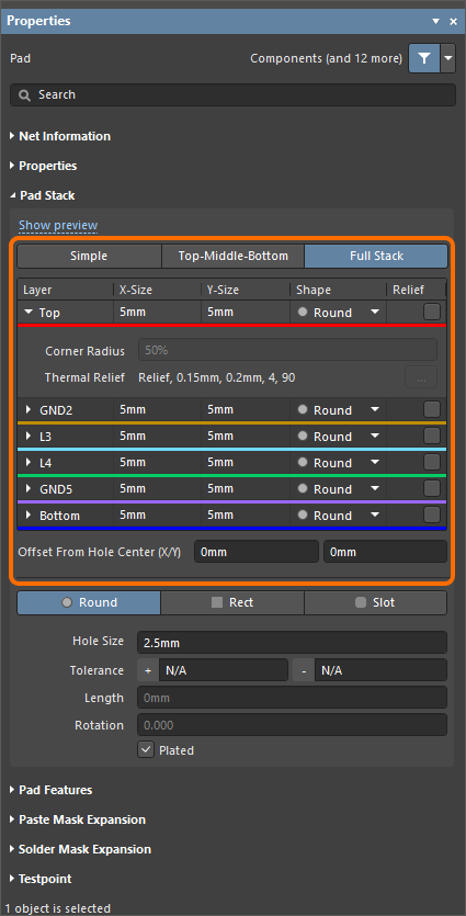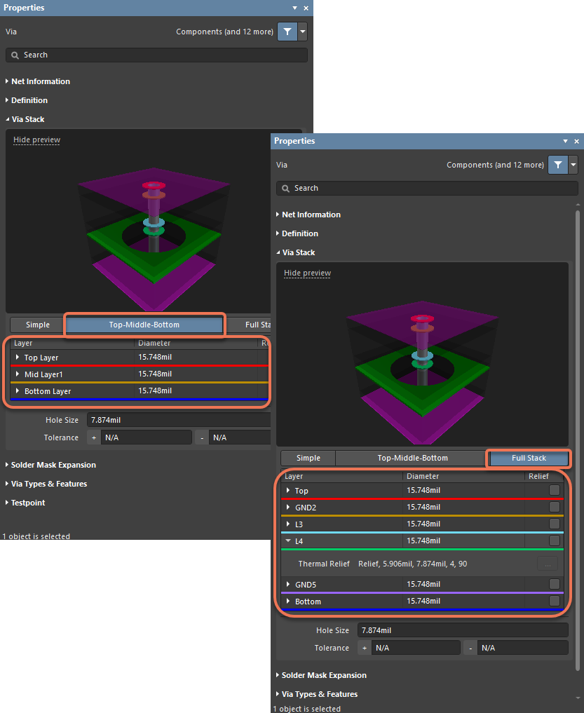 Additionally, when a via that has the via type set to IPC-4761 in its properties is placed in a PCB design, new types of mechanical layers and component layer pairs are automatically added to the design, with corresponding shapes on