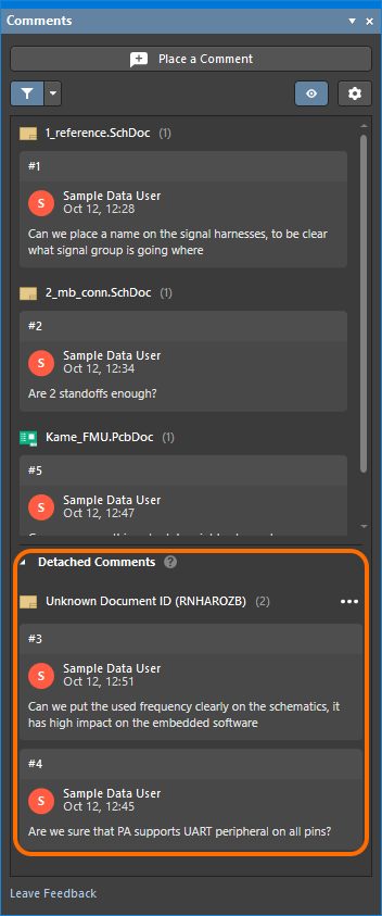 When a project document is removed or its UniqueID has changed, the comments for the document can become "detached". Those comments can still be accessed from the panel's Detached Comments collapsible region. Click on a