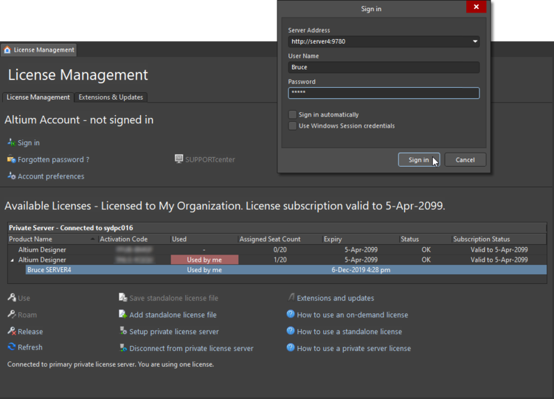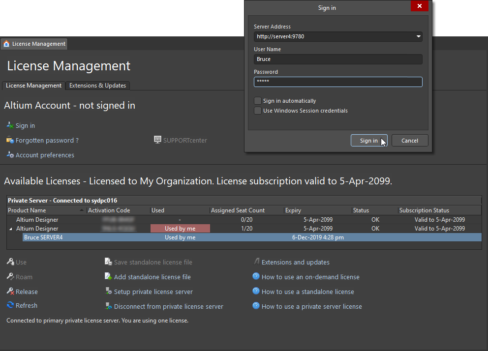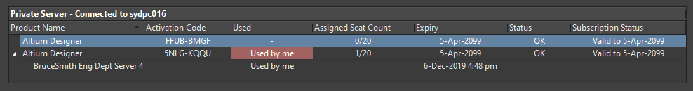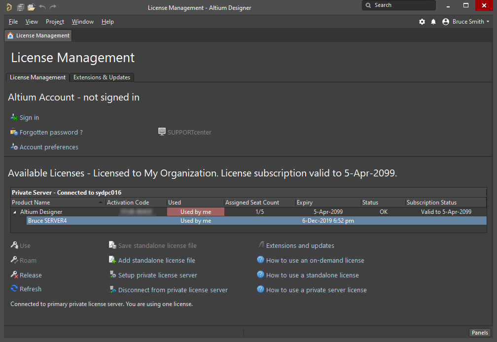 In the below image, user Bruce has signed in to his account in the local server SERVER4, which is set to source licenses from the central licensing AIS (sydpc016). Here, the Altium software is using a seat of a license offered by the central licensing service (the AIS), which is regarded as leased by Bruce SERVER4 – this is the First Name + Second Name entries of the automatically generated User account in the AIS. Note also that the licenses table heading indicates that the source of the available licenses is a Private Server, which in this case is sydpc016.