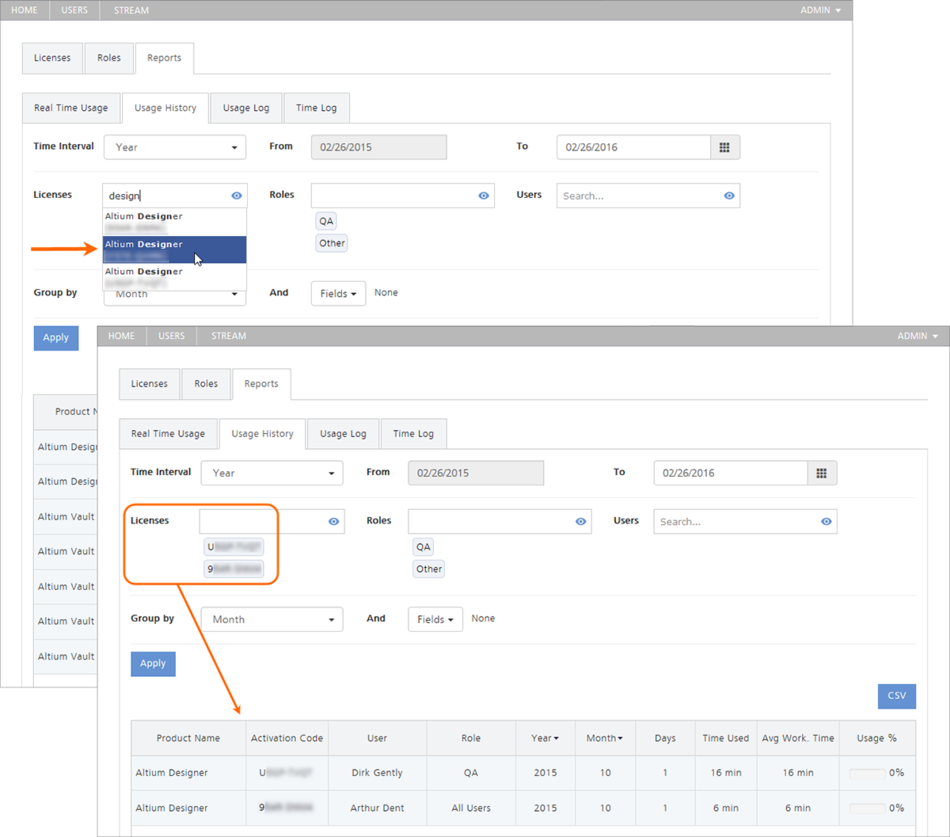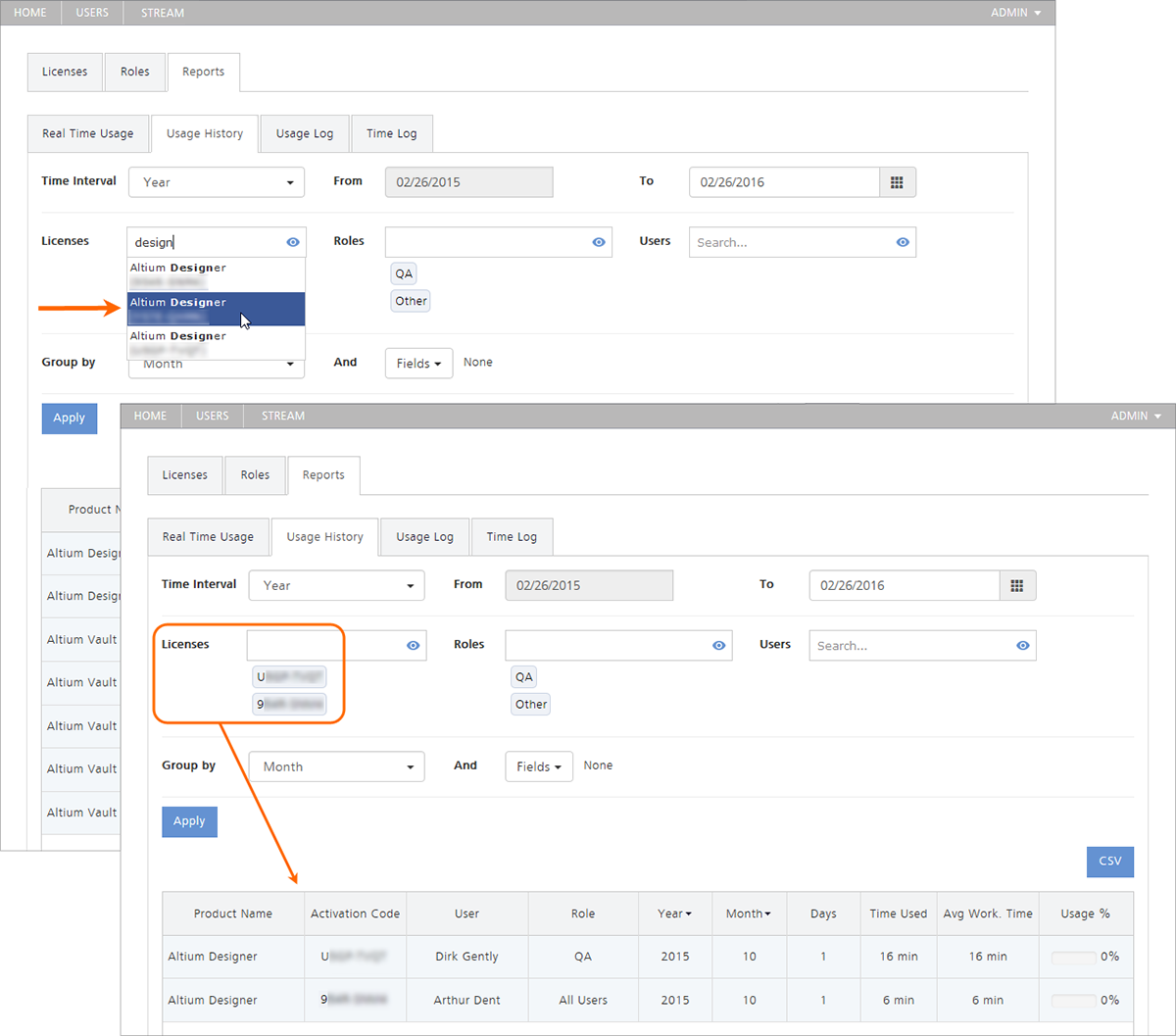 To filter the usage reporting results to show the license activity of a particular set of Licenses for example, select the licenses of interest from the Licenses drop down menu and click