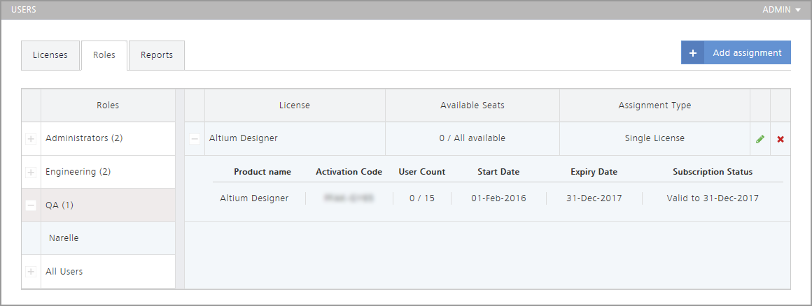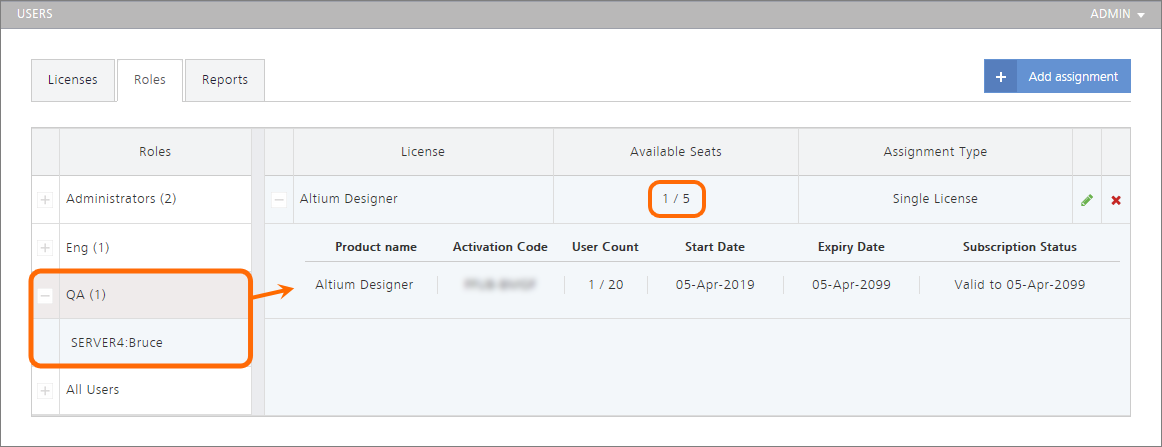 Here, a 5-seat license has been added to the Engineering Role and its member workstation accounts (Users). For details about the assigned license, select the expand option (