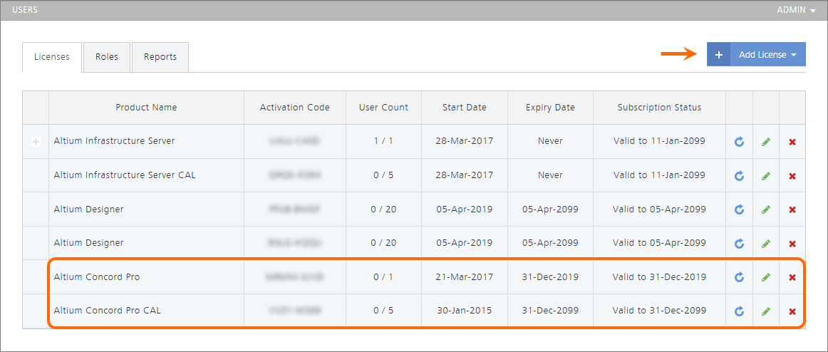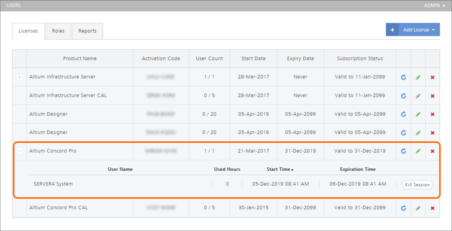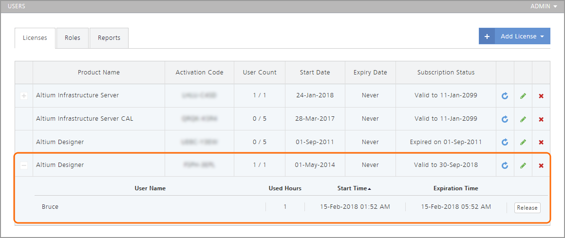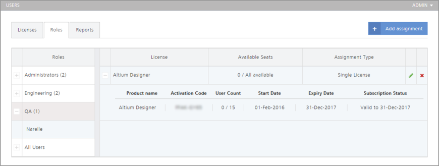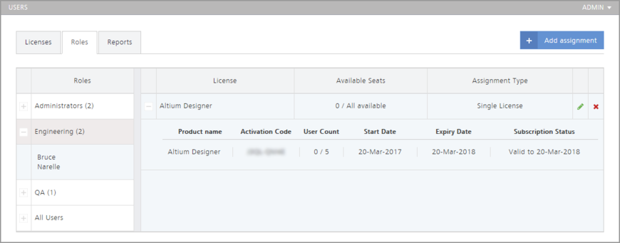 Select the licensing list (ADMIN » LICENSES) to access the licenses that have been acquired by the AIS, which can then be assigned to the desired Roles. In the example shown below, two Altium software licenses have been added to the AIS, and are initially assigned to the default All Users role.