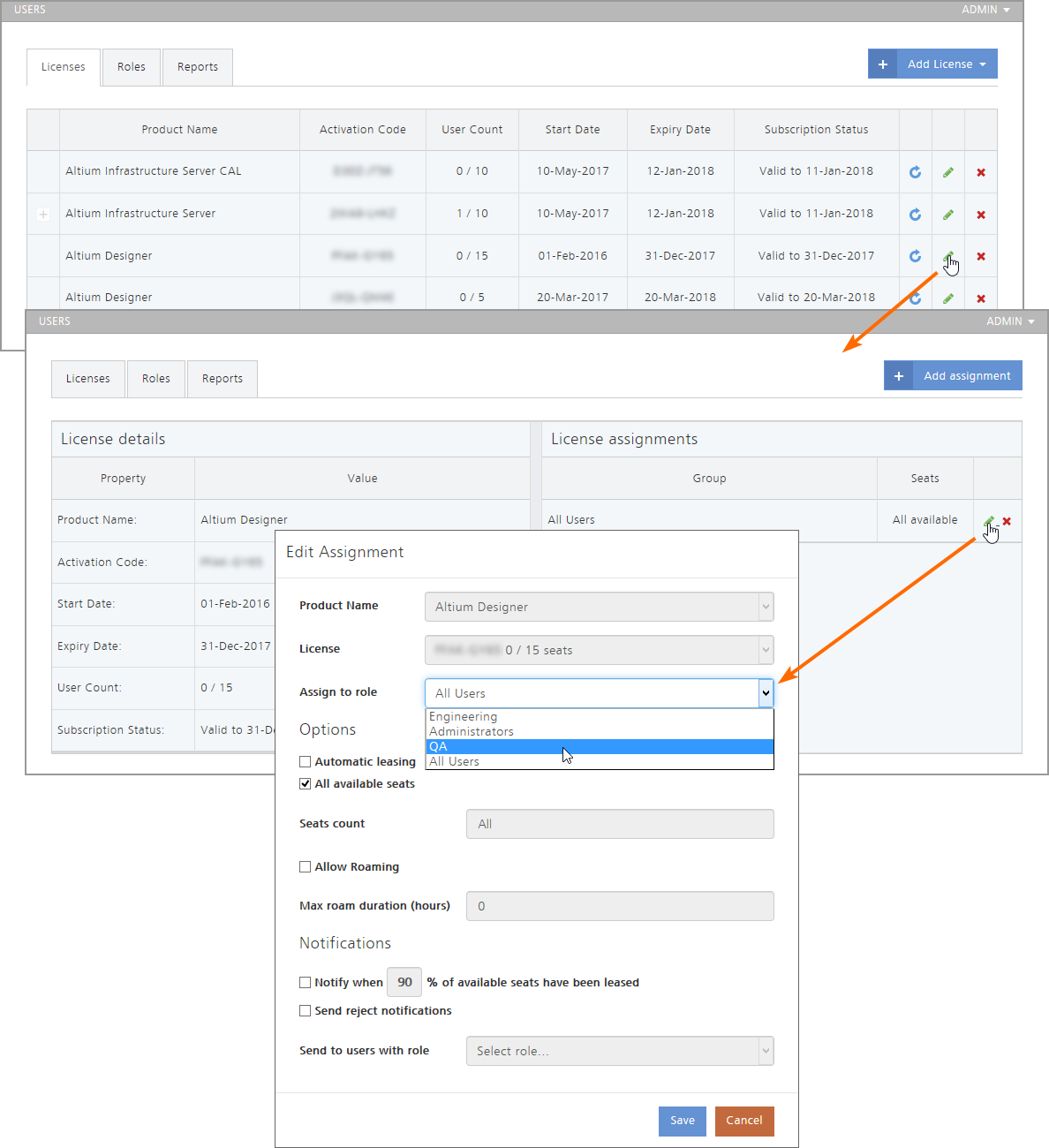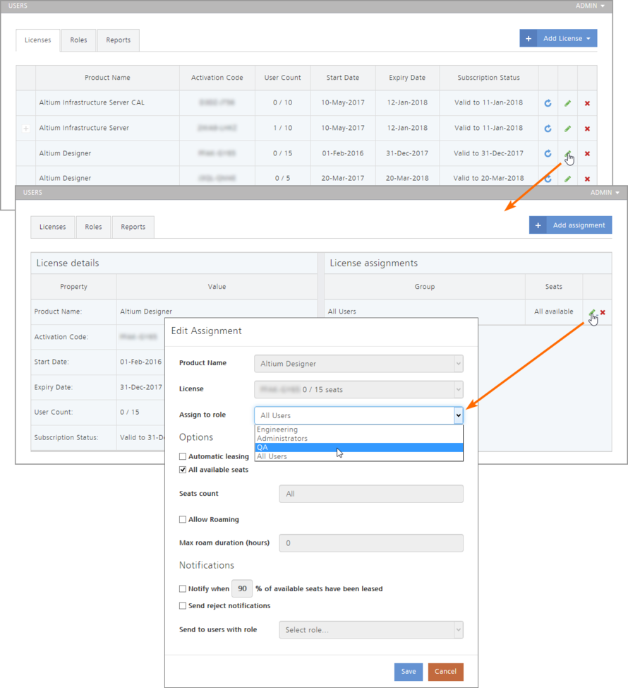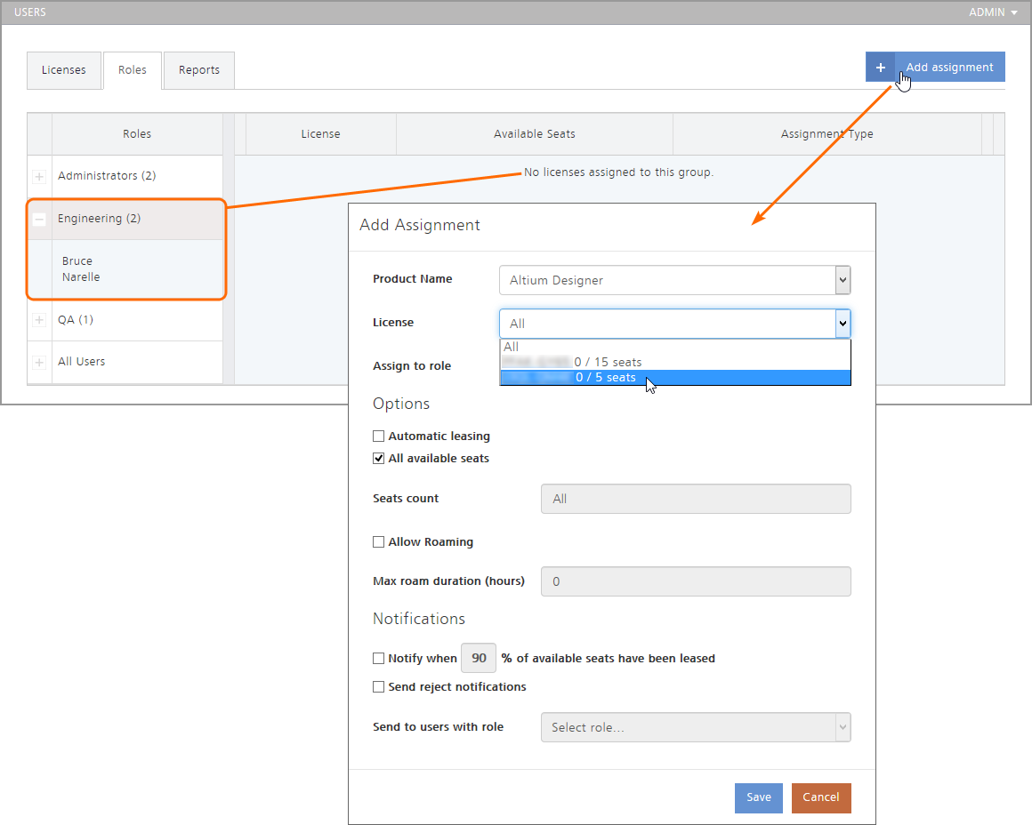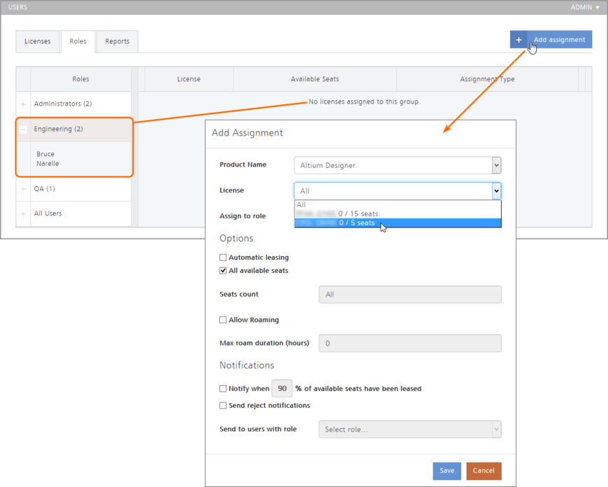 Narelle (Narelle/ENGINEERING-3)Narelle is a member of the Engineering and QA Role groups.Engineering Role has the 15-seat license assigned to it, and the QA Role has the 5-seat license assigned to it.The AIS based Private License Service offers a range of administration features for managing license allocation and usage, including the ability to forcibly release a leased license and closely monitor how licenses are used.