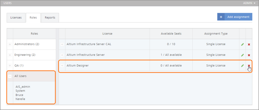 Deleting the license's additional All Users Role assignment will leave the license only assigned to the Engineering Role, rather than both, and thereby exclusively available to the Engineering group of Users. To delete an existing license assignment use the