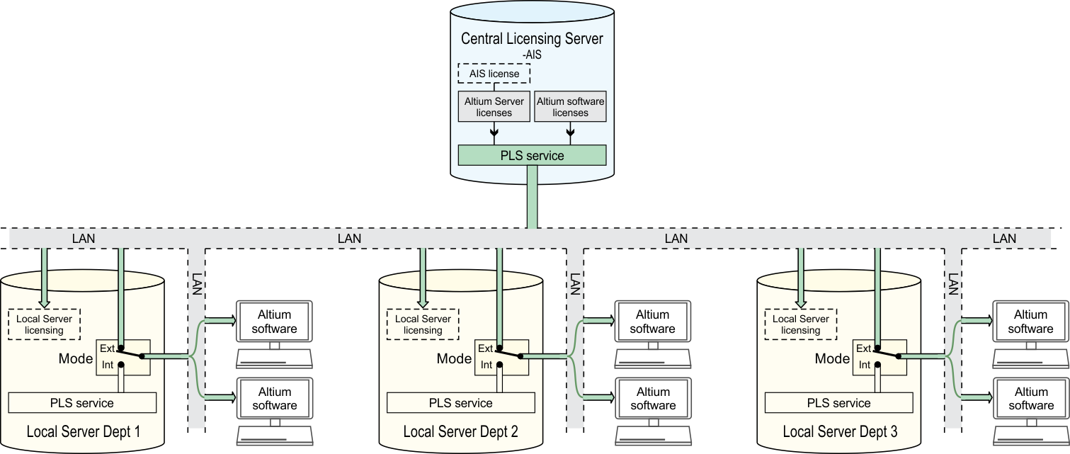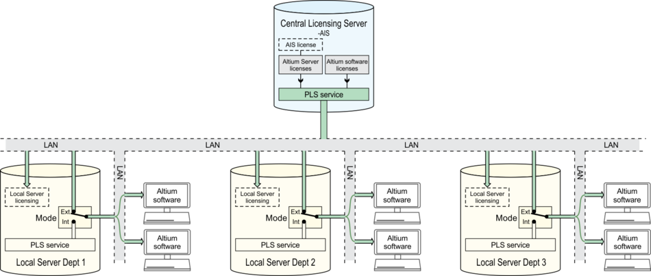 This type of installation is suited to a large enterprise, where each company department (Engineering, QA etc) might use multiple Altium software installations, and a local department Server for design data management purposes. Both the Altium Servers and Altium software installations are licensed by a central, dedicated licensing service such as the License Manager (PLS) in the Altium Infrastructure Server (AIS).