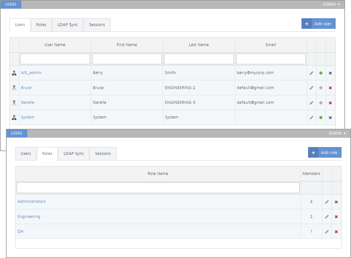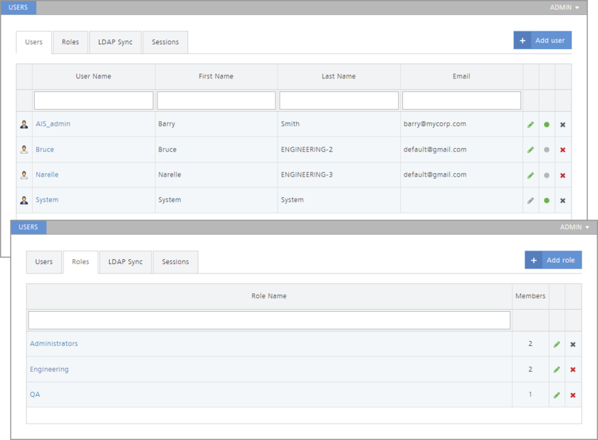 In the case shown in the below image, two workstations (ENGINEERING-2 and ENGINEERING-3) have connected to generate matching User profiles (Bruce and Narelle) based on the workstation active Windows Account. Two Roles have been added (Engineering and QA), and the users added as members of those Roles (Bruce is a member of Engineering, and Narelle is a member of both Engineering and QA).