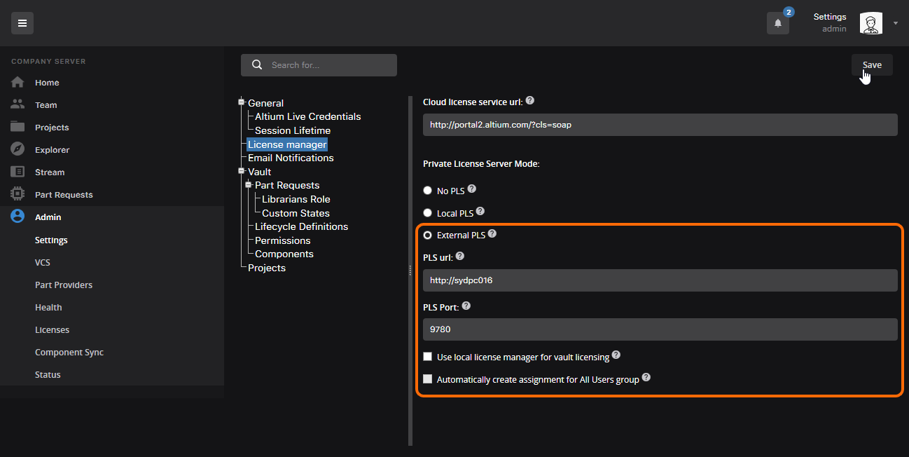 The Altium Server also needs to be switched over from seeking its own licenses from its internal PLS, to accessing these from the specified external PLS service – the AIS. This is achieved by unchecking the Use local license manager for vault licensing option, as shown above.