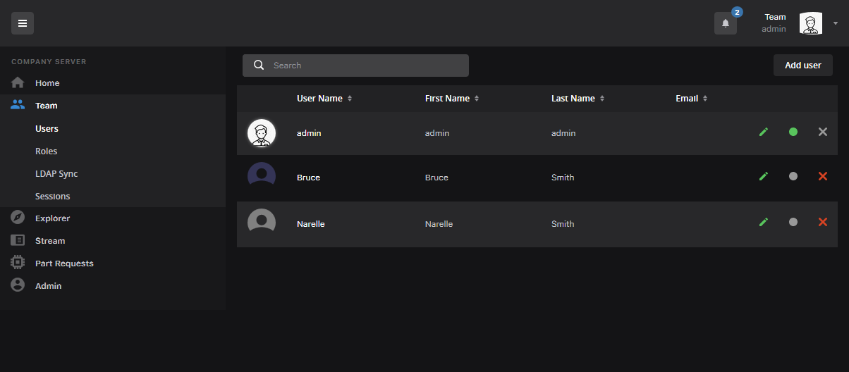 By way of example, the below image shows a department server (Altium Concord Pro hosted on SERVER4) with two registered User accounts; Bruce and Narelle. These represent accounts for local users that sign in to the server to access its data management services. This server represents one of the local department Servers illustrated in the above multiple server image, where all licenses are sourced from the central licensing service in the AIS.