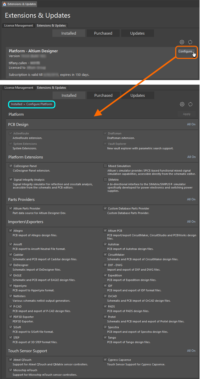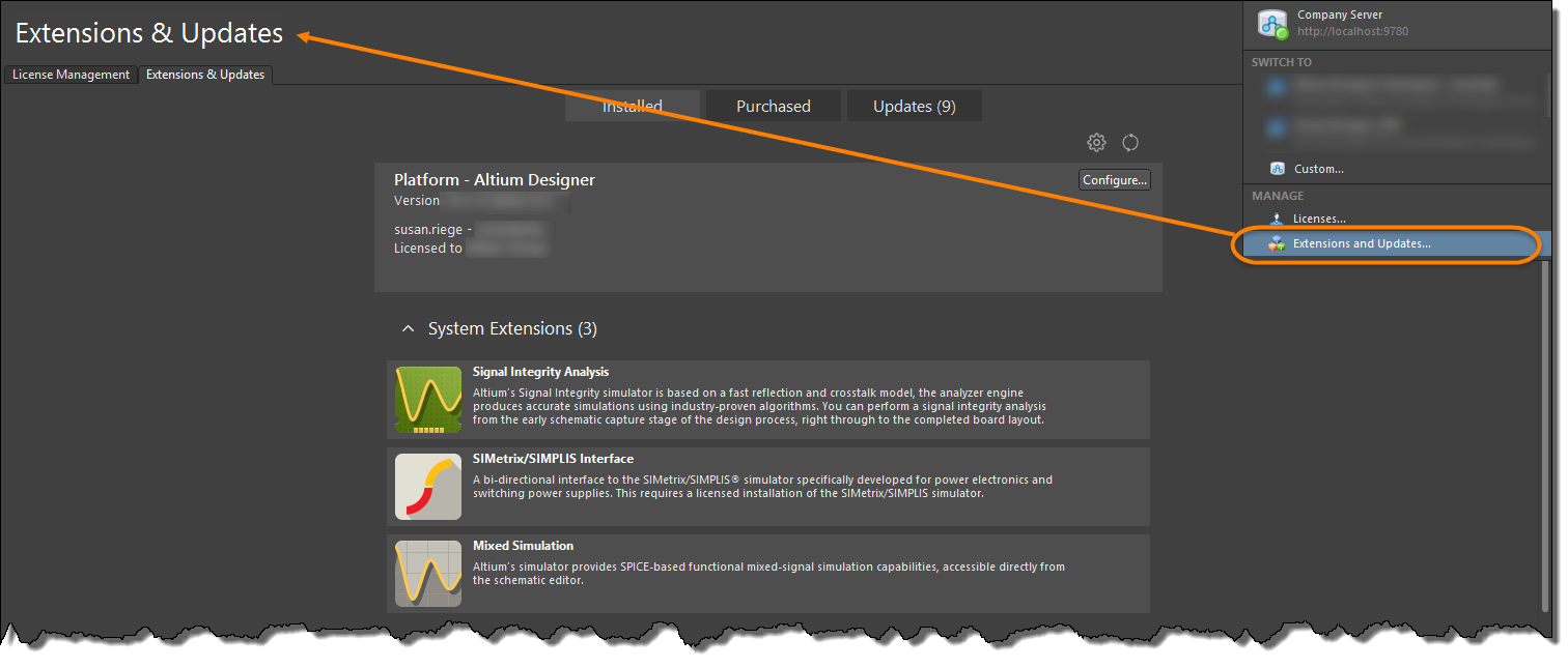 • Internally from within Altium Designer - from the Installed page of the Extensions & Updates view.