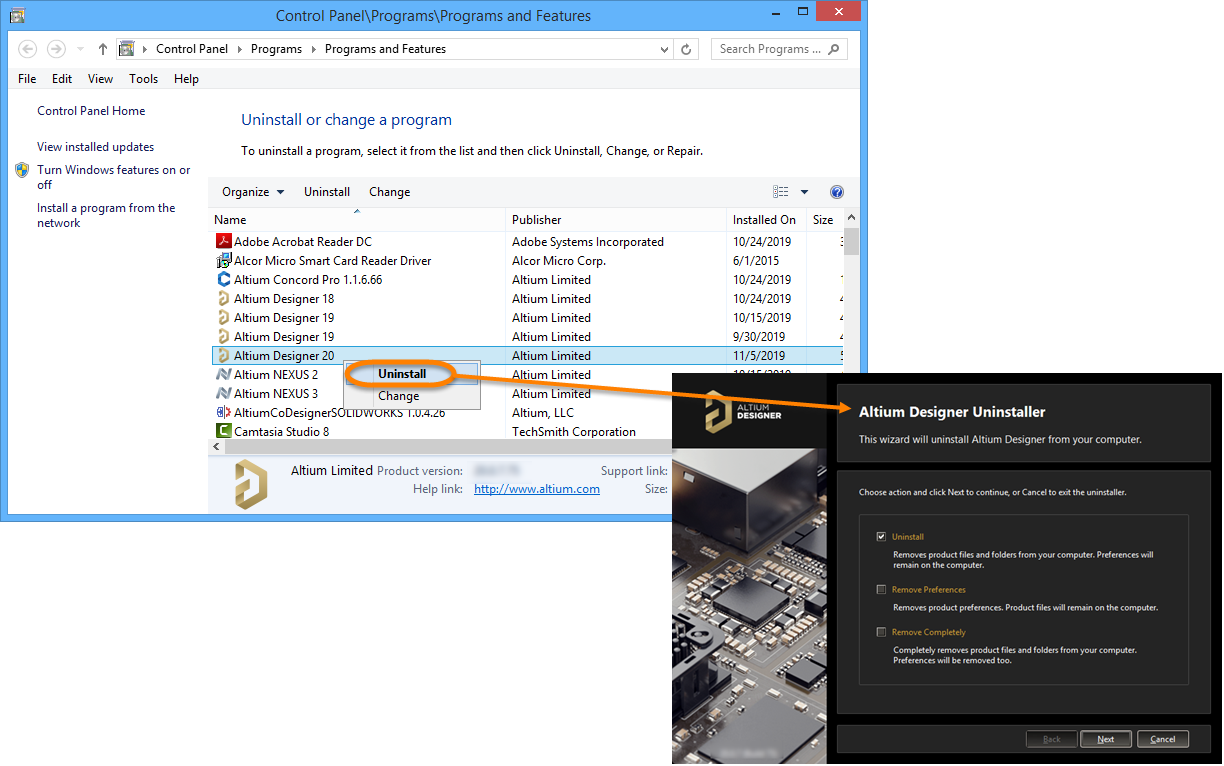 Uninstalling Altium Designer is performed using the Altium Designer Uninstaller. This wizard-based uninstaller is accessed from the standard Programs and Features page (accessed from the Control Panel in Windows 7 and above). Right-click on the entry for Altium Designer and use the Uninstall command from the context menu.