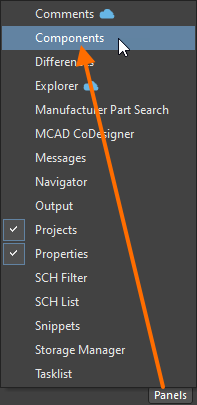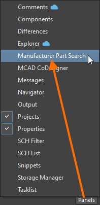 button at the bottom right of the application window and select Manufacturer Part Search from the menu. Panels that are currently visible are marked with a check in the menu.