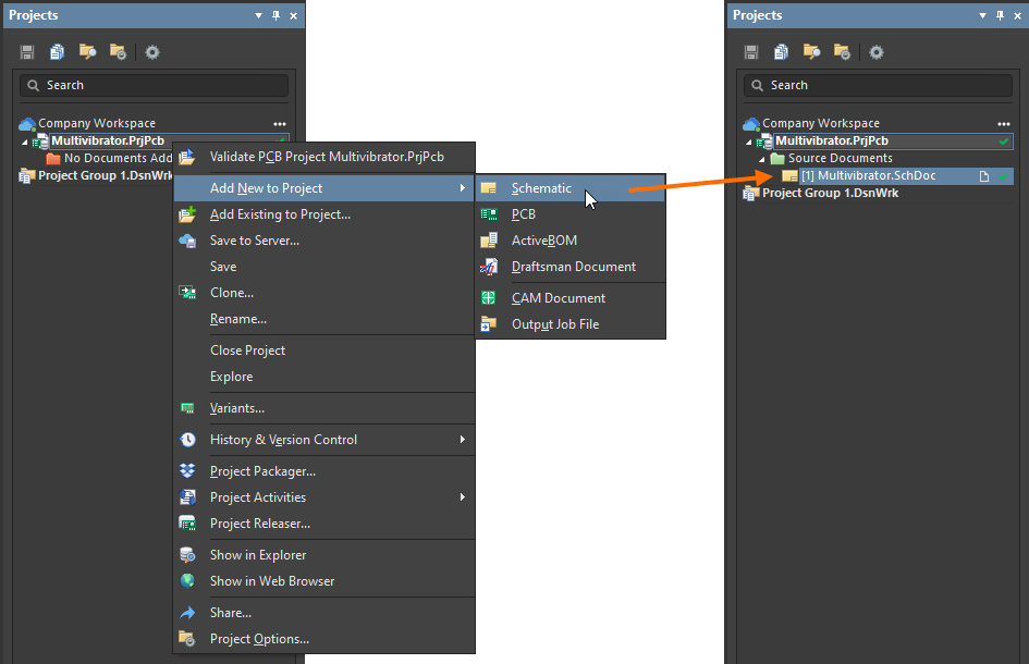 Right-click on the project filename in the Projects panel then select Add New to Project » Schematic, as shown in the image above. A blank schematic sheet named Sheet1.SchDoc will open in the design space and an entry for this schematic will appear linked to the project in the Projects panel under the Source Documents folder icon.