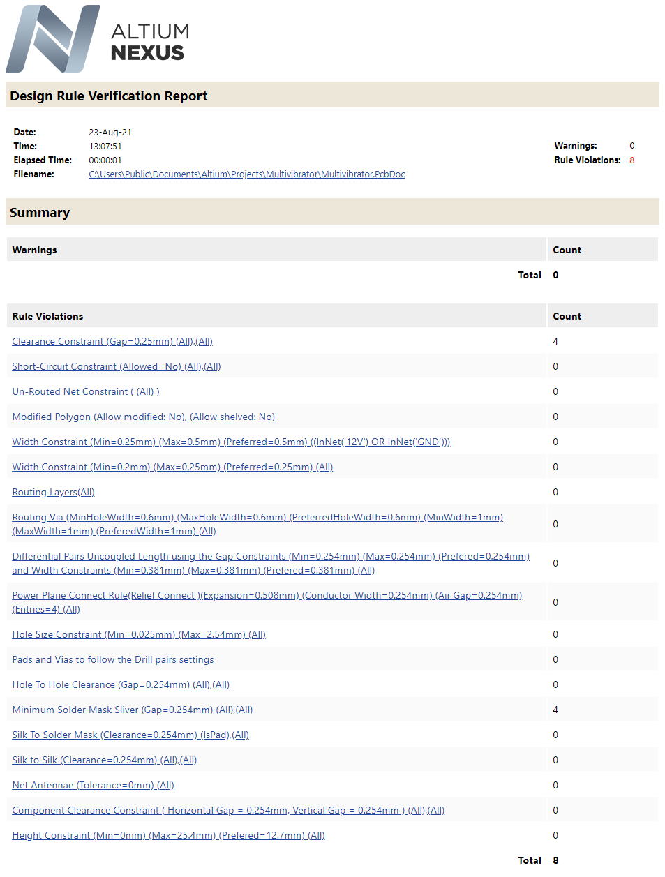 The next stage of the release process – 2. Validate Project – is run automatically when one or more Validation-type reports are detected in assigned OutJob file(s). As the Fabrication OutJob file includes generation of the Desing Rules Check report, this validation output generator is run.