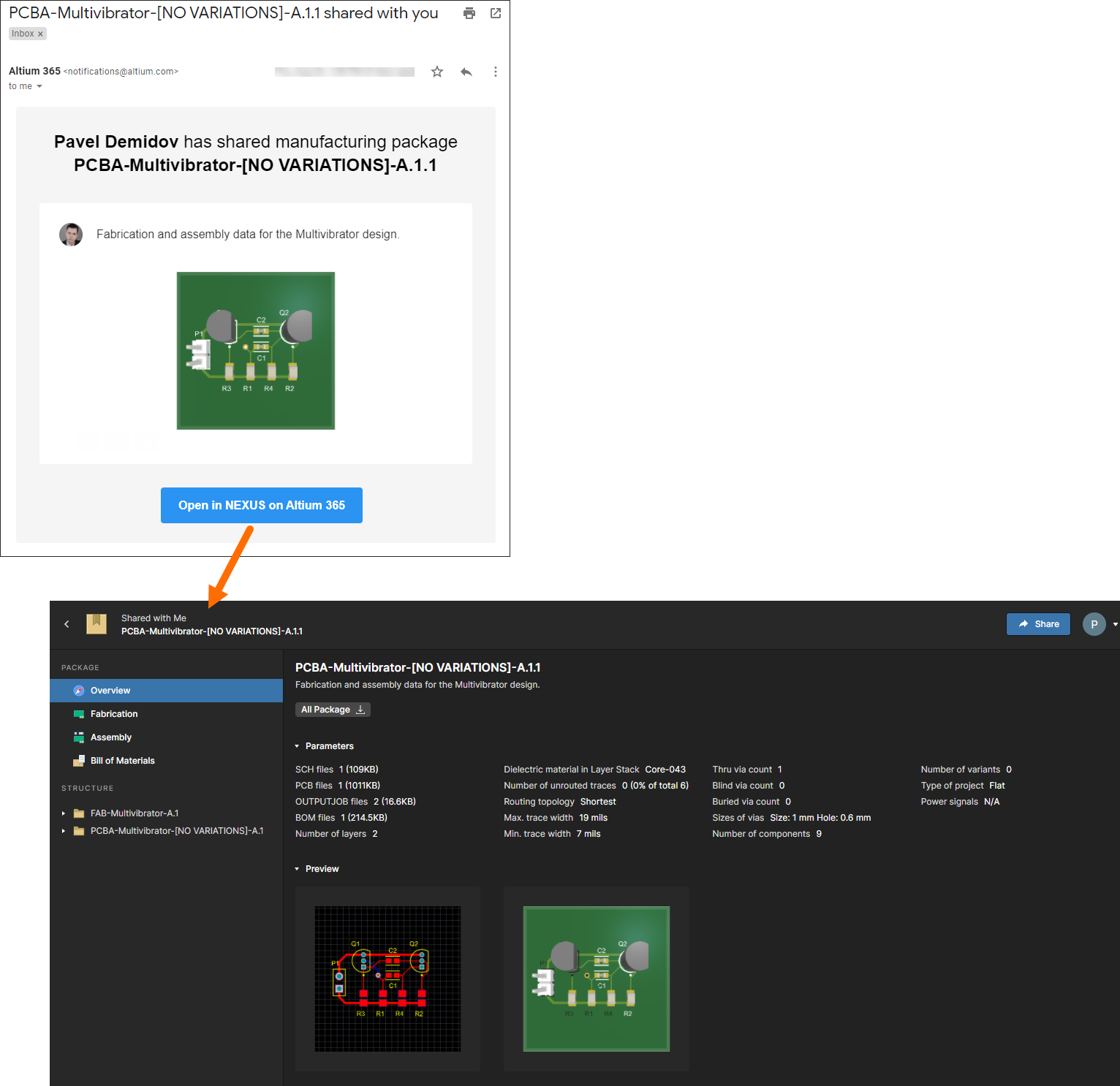 Accessing the shared manufacturing package from the email invite that is received by the manufacturer.