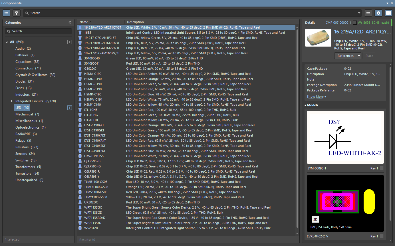 Components for your PCB design project can be created in and placed from your company's Workspace library. These components are placed through the Components panel that uses Altium NEXUS's advanced component search engine.