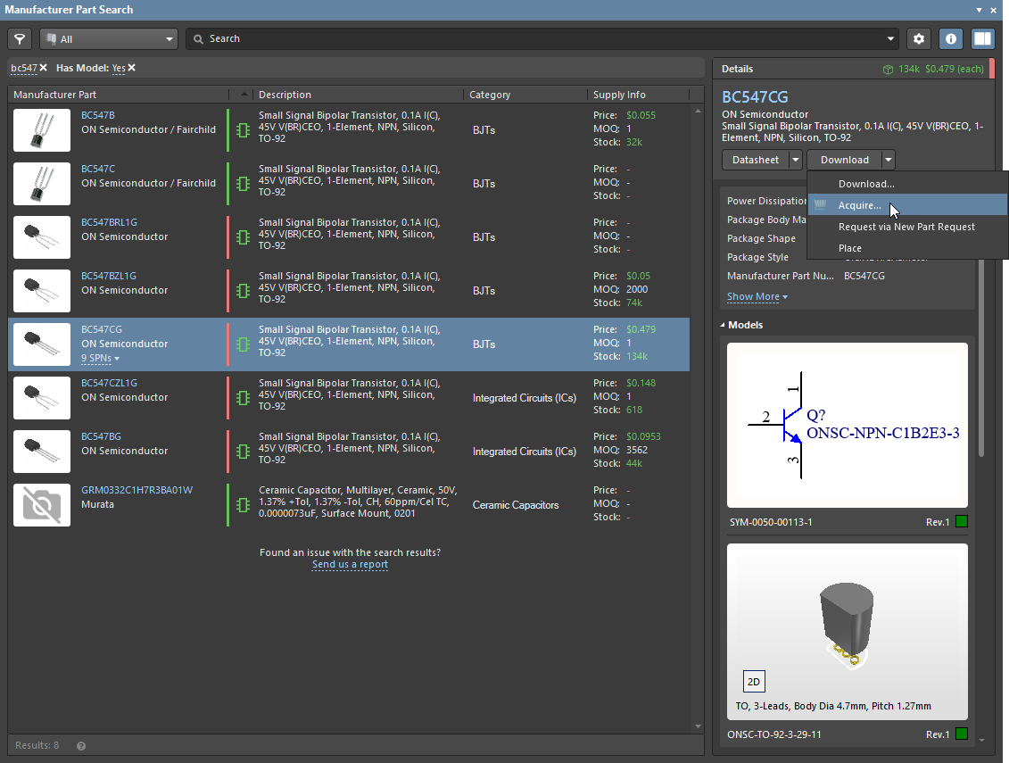Your go-to location to find new components is the Manufacturer Part Search panel. To open the Manufacturer Part Search panel, click the
